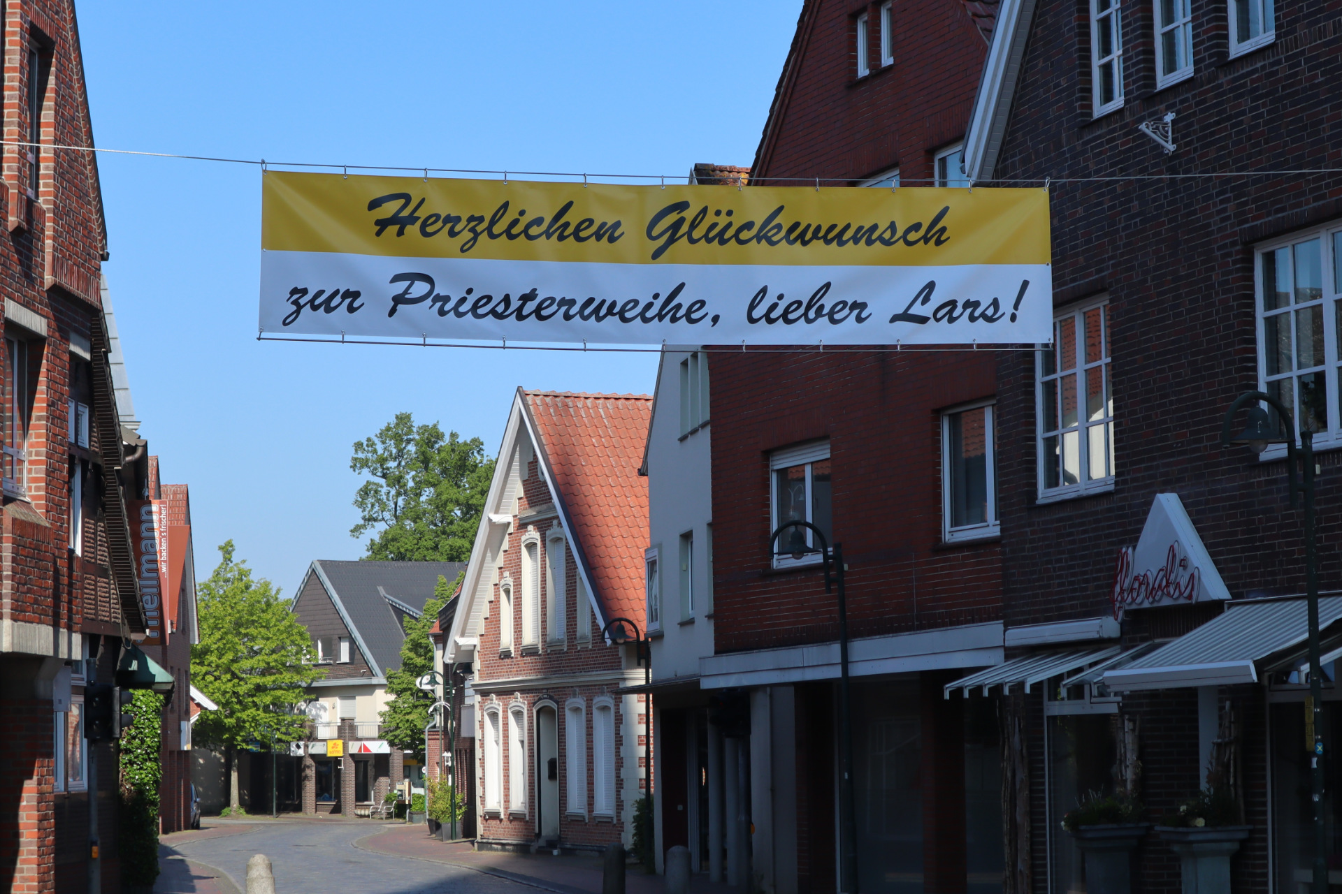 Am heutigen Sonntag, den 30. Mai 2021, feierte Lars Schlarmann seine Primiz in der Kirche St. Johannes Baptist in Steinfeld. Nicht nur die Straßen in der Nachbarschaft der Kirche waren festlich geschmückt, auch der Gottesdienst bot alles, was in einem Corona-Jahr möglich war. Durch eine intensive Vorbereitung konnten viele Sitzplätze der Kirche für Mitfeiernde ermöglicht werden. Der neugeweihte Priester zog in einem großen Einzug mit Messdienern, einer Fahnenabordnung und vielen Mitbrüdern in seine Heimatkirche ein. Dort wurde er musikalisch von der Organistin Maria Laux und zwei Trompetenspielern des Kolpingorchesters empfangen.
