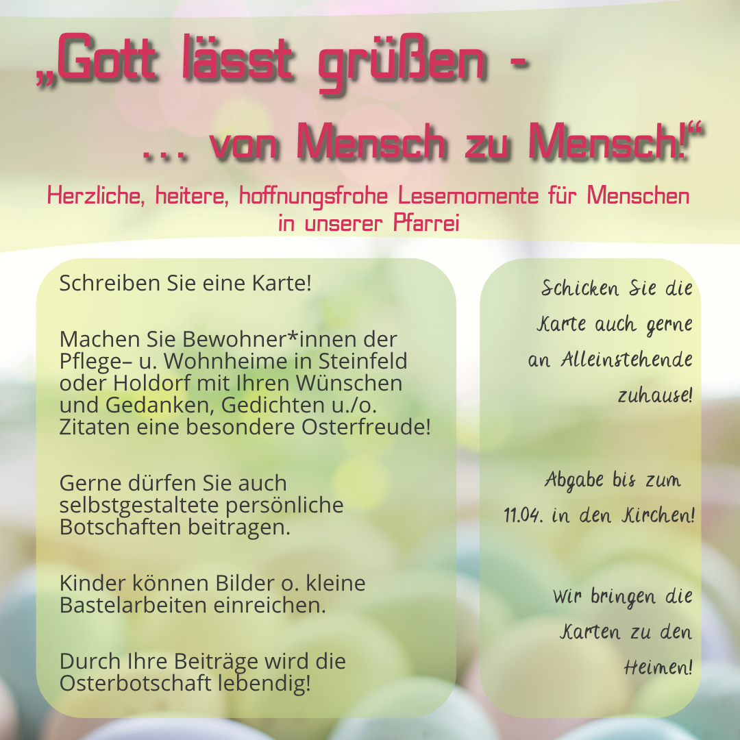 In den Kirchen liegen Postkarten bereit, die für Menschen gedacht sind, die sich sehr über einen lieben Gruß freuen. Schreiben Sie eine Karte! Machen Sie Bewohner*innen der Pflege– u. Wohnheime in Steinfeld oder Holdorf mit Ihren Wünschen und Gedanken, Gedichten u./o. Zitaten eine besondere Osterfreude! Gerne dürfen Sie auch selbstgestaltete persönliche Botschaften beitragen.Kinder können Bilder o. kleine Bastelarbeiten einreichen.Durch Ihre Beiträge wird die Osterbotschaft lebendig!